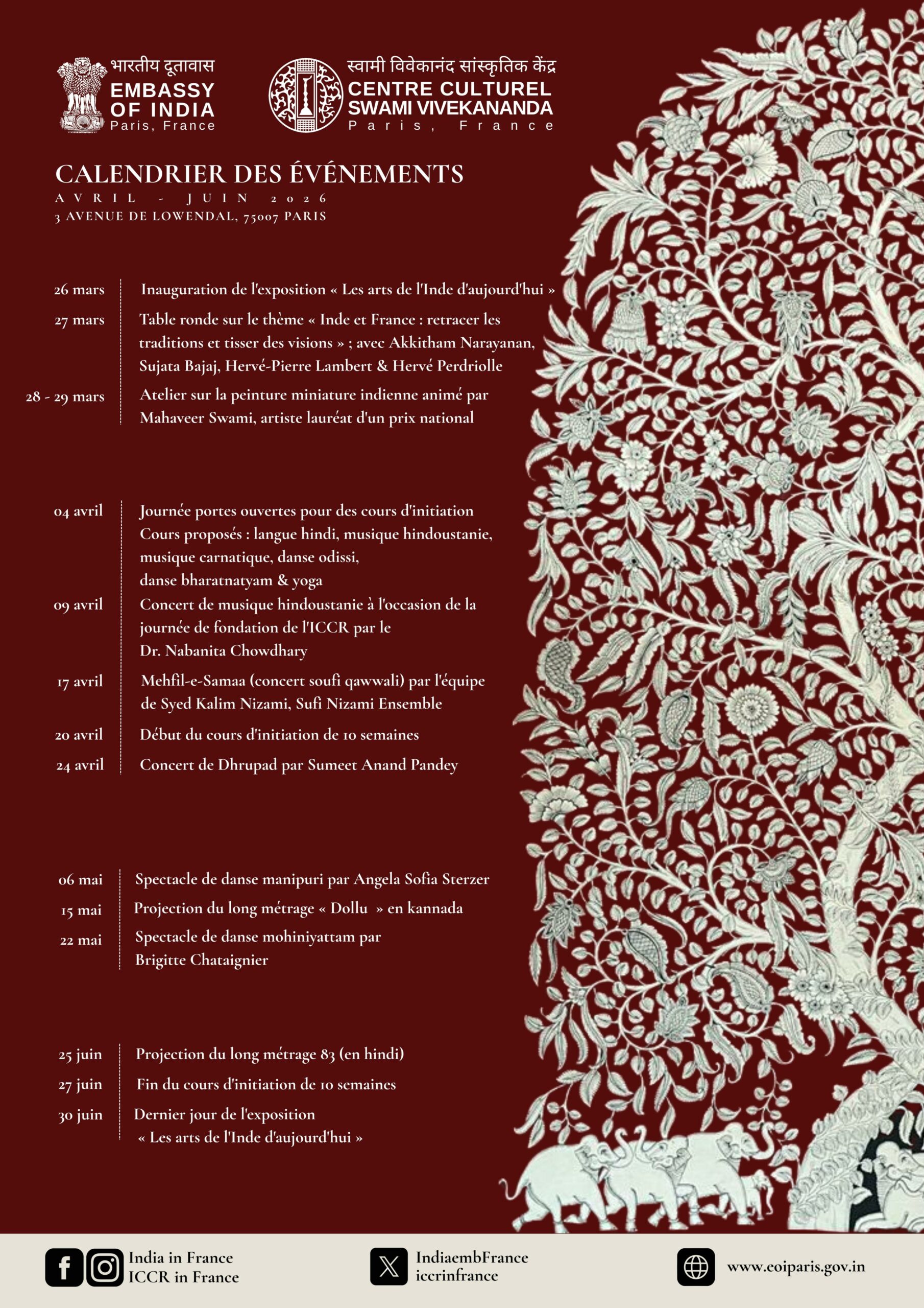 Dans le cadre de l’inauguration du Centre Culturel Swami Vivekananda (nouveau Centre Culturel Indien à Paris), l’Ambassade de l’Inde organise une série d’évènements dont voici le calendrier (ci-dessous).